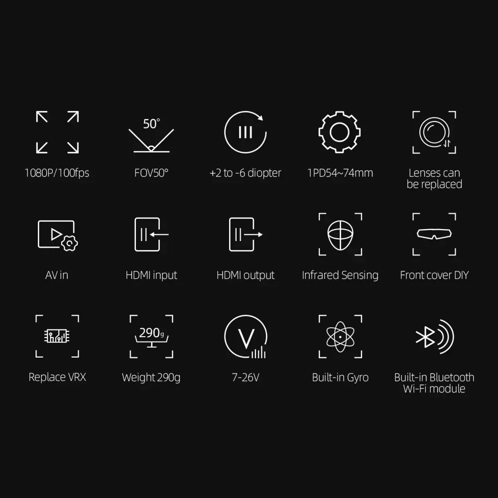 The built-in Bluetooth Wi-Fi module allows pilots to connect their goggles to an app and access a range of features, including sharing their FPV experience on social media, wireless upgrading firmware, map mode for locating the drone, and live viewing goggles screen. This feature is a future intended functional update.