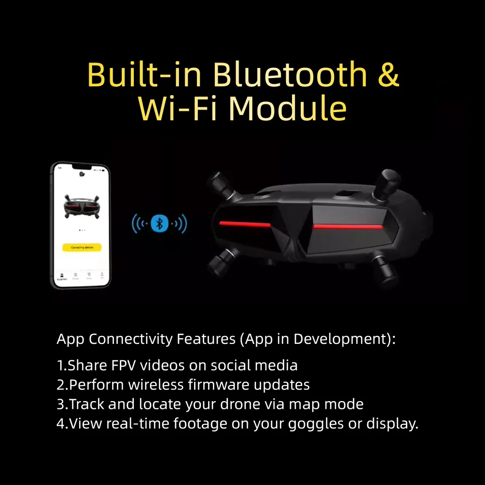 The built-in Bluetooth Wi-Fi module allows pilots to connect their goggles to an app and access a range of features, including sharing their FPV experience on social media, wireless upgrading firmware, map mode for locating the drone, and live viewing goggles screen. This feature is a future intended functional update.